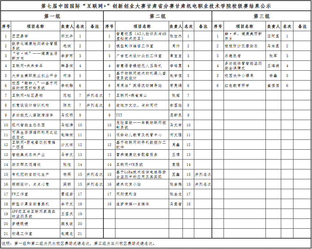 按照《甘肃省教育厅关于举办第七届中国国际“互联网+”大学生创新创业大赛甘肃省分赛的通知》要求,经学生个人申报、招生就业处资格审查、校内专家组评审等环节,拟确定以下45项作为我校2021年度“互联网+”大学生创新创业项目予以上报,现予以公示。